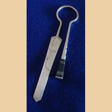 Bijou touareg, marque page en argent thaler et cuivre, motifs gravés, liserés ébène à l’extrémité, la partie plate se met à l’intérieur du livre, et l’autre partie à l’extérieur