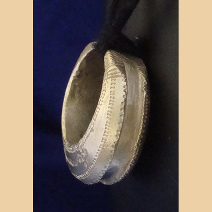 Bijou touareg ancien, gros anneau lourd et épais, en argent thaler, ciselé sur les bords, motifs gravés, monté sur un écheveau de fils coton noir