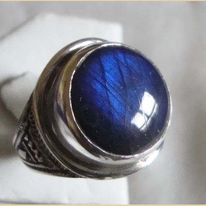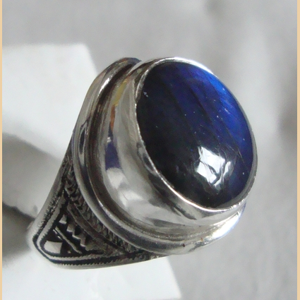 Bijou touareg, bague en argent, motifs gravés, cabochon labradorite bleu serti