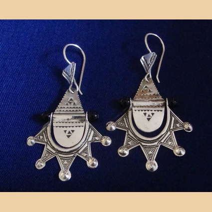 Bijou touareg, boucles d’oreille en argent, motifs gravés,perles verre noires