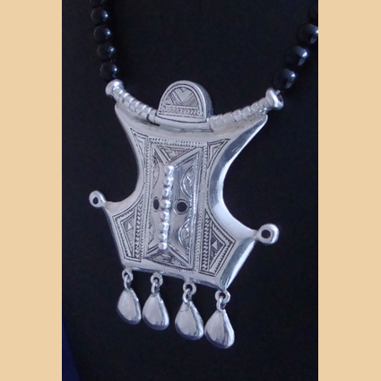 Bijou touareg, pendentif en argent, en relief au centre, motifs gravés, points d’incrustation d’ébène, monté sur collier perles onyx, le fermoir est un mousqueton argent