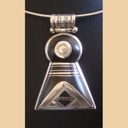 Bijou touareg, pendentif ébène serti d’argent, liserés d’argent incrustés, anse articulée, dessins gravés