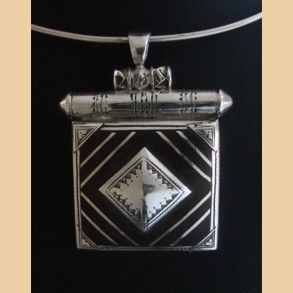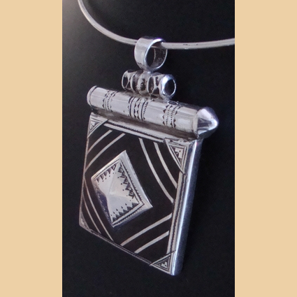 Bijou touareg, carré d’ébène serti d’argent, plaque d’argent au verso, liserés d’argent incrustés dans l’ébène, motifs gravés.