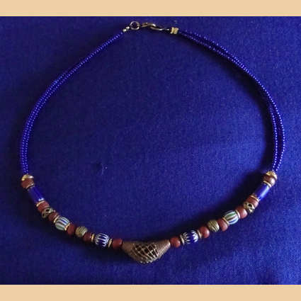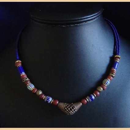 Collier monté sur 2 fils câble, composé au centre d’une perle Baoulé en filigrane, alternée avec des petites perles chevron, 14 petits disques en métal doré, 4 petites perles laiton baoulé, 12 perles verre anciennes brunes, le collier se termine avec des perles verre rocaille bleu, le fermoir est un mousqueton en laiton